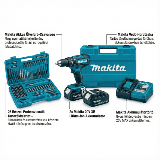 Makita Akkus fúrócsavarozó | Teljes Készlet + 2 Akkumulátor + 26 Tartozék